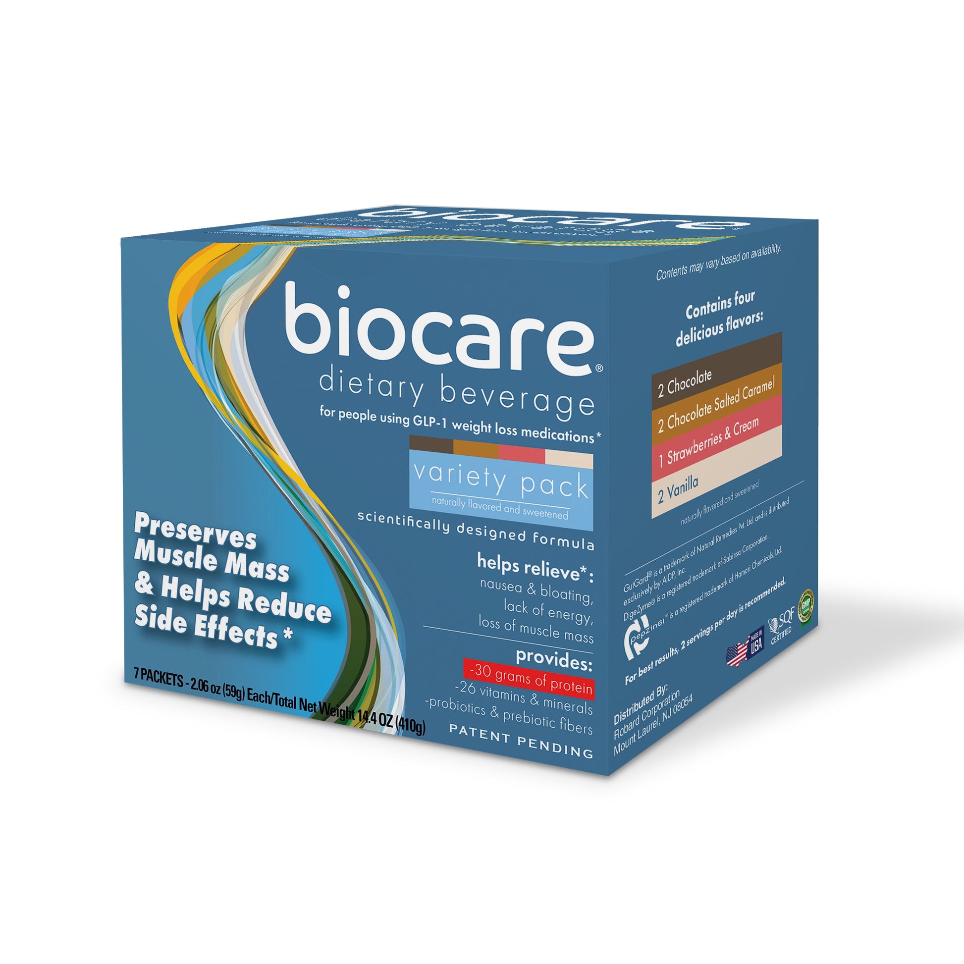 Discover your favorite flavor with the Biocare 30G Protein Beverage Variety Pack! This 7-count pack includes a delicious mix of beverages — 2 Vanilla, 2 Chocolate, 2 Chocolate Salted Caramel, and 1 Strawberries & Cream — each packed with 30 grams of high-quality protein, essential vitamins, and anti-nausea ingredients. Specially designed for individuals on GLP-1 medications like semaglutide, these beverages help combat medication side effects while supporting weight management, muscle maintenance and overall wellness. Perfect for variety, convenience, and great taste — try Biocare’s protein beverage variety pack today!