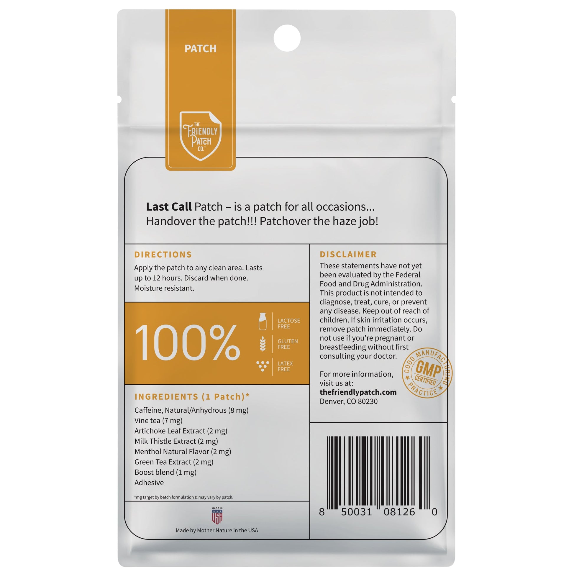 The Vine Tea and caffeine in the Last Call Patch is a group of essential blends that, help bring on the new day. Artichoke Leaf Extract is another natural ingredient for a healthy lifestyle.
