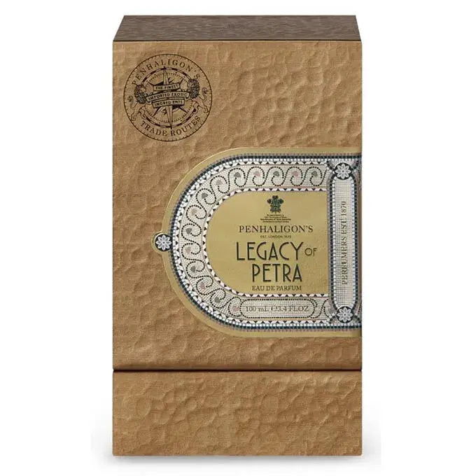 Legacy Of Petra By Penhaligon's For Unisex 3.4oz EDP Spray is a mesmerizing fragrance inspired by the historic and enchanting city of Petra. Opening with aromatic fennel seed and an intriguing blend of green tea, it instantly transports you to ancient spice markets. The heart blooms with warm myrrh and rich licorice, creating depth and mystery, while the base settles into creamy vanilla and luxurious benzoin for a lasting, elegant trail.