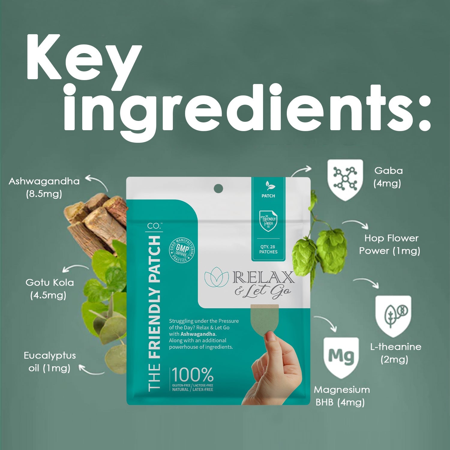 Relax & Let Go Patches, formerly known as Zen, are a plant-powered patch for relaxing. Are you worried about work, school, or just life in general? Let our Calm & Relax patch help you relax. Packed with herbal ingredients like Ashwagandha for calm, Gaba - for calm, and Gotu Kola, wearing this Relax & Let Go patch will feel as comfortable as a friendly shoulder to lean on to ease your nerves when life gets stressful.
